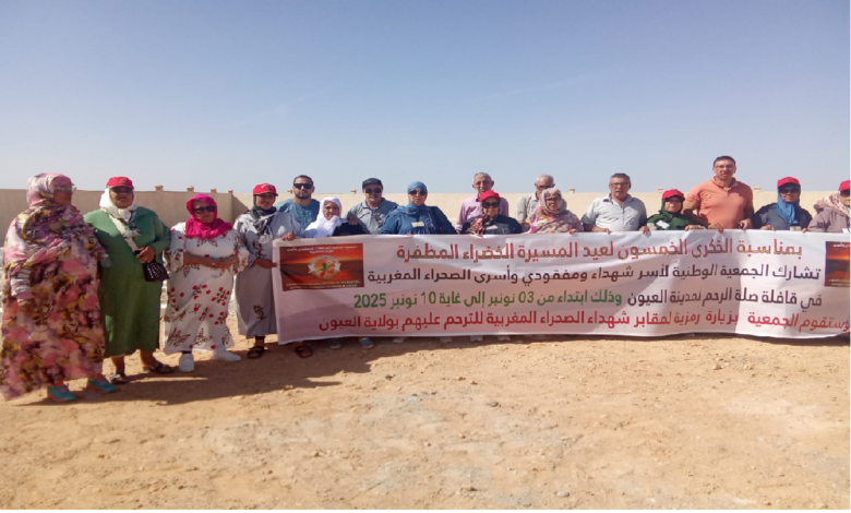 تخليداً للذكرى المجيدة للمسيرة الخضراء المظفرة، وفي جو وطني يطبعه الفخر بالانتصارات المتتالية التي تحققها المملكة المغربية، تحت القيادة الحكيمة لجلالة الملك محمد السادس نصره الله، نظمت الجمعية الوطنية لأسر شهداء ومفقودي وأسرى الصحراء المغربية، زيارة رمزية لمقابر الشهداء بمدينة العيون، وفاءً لأرواحهم الزكية واستحضاراً لتضحياتهم الخالدة في سبيل الوحدة الترابية للمملكة